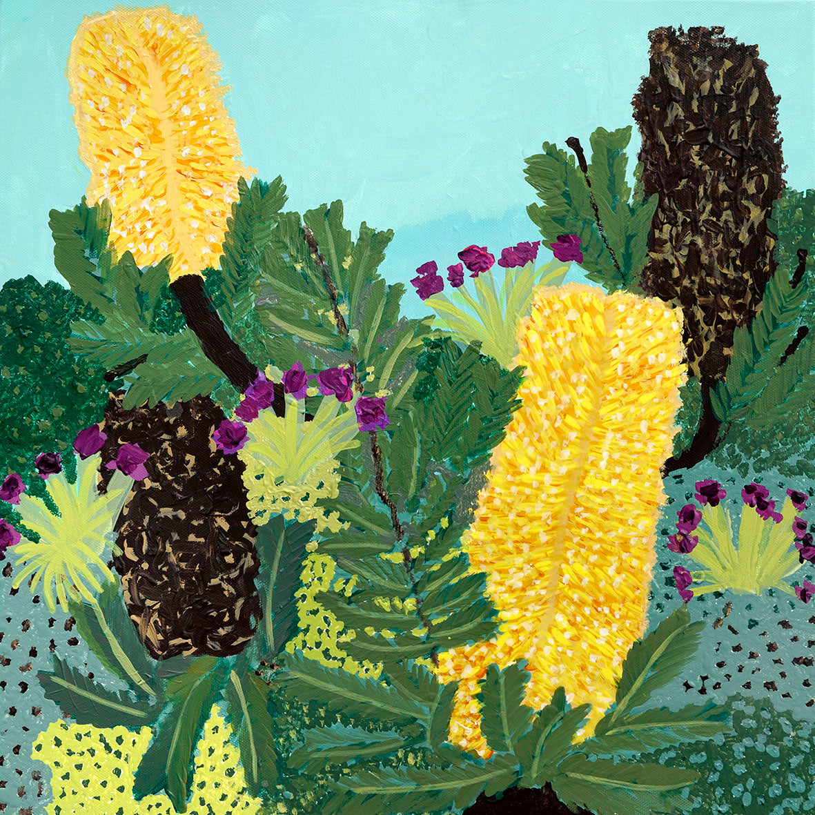 The timing of the Artist’s exhibition meant that Morgan was able to experience the grounds of Lon throughout Autumn, Winter and Spring which provided an array of colours, textures and shapes. The large yellow banksia, being the focus of this piece.