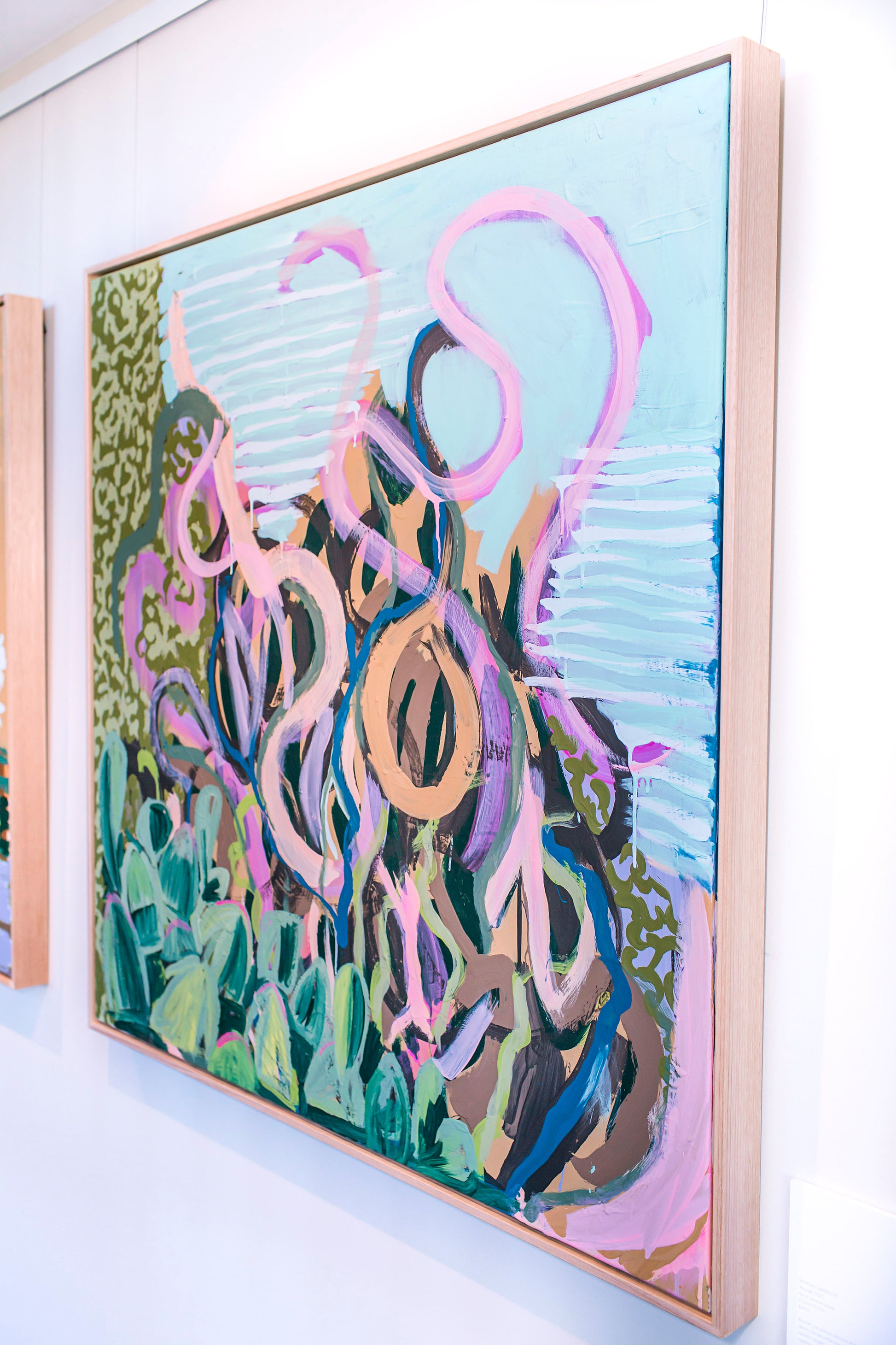 Moonah is an abstract depiction of the geographical Point of Pt Lonsdale (aerial), the native flora that hug this beautiful stretch of coastline and the beautiful, tangled, intricate details of the Moonah Trees of the area. Fused together with a small pocket of ‘Pig’s Ear’, Morgan has focused on the shape elements of both studies to bring together this piece with her signature and sometimes unexpected use of colour.